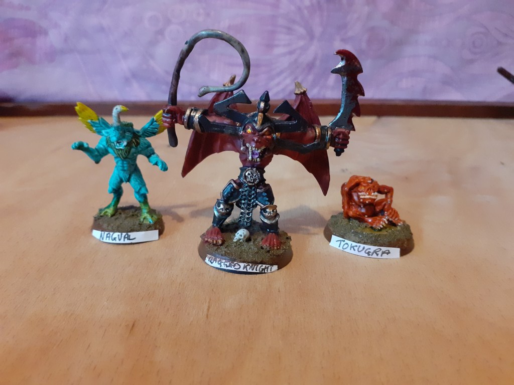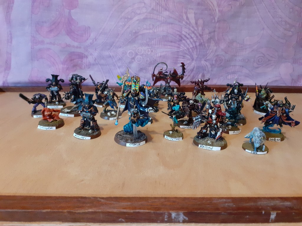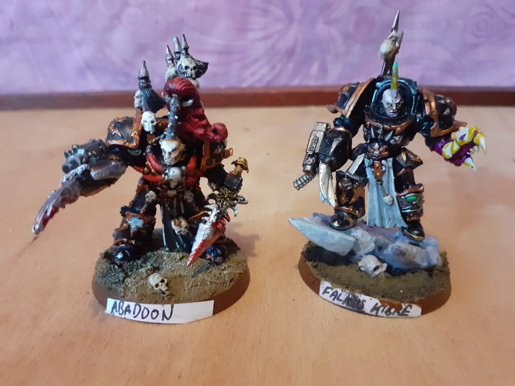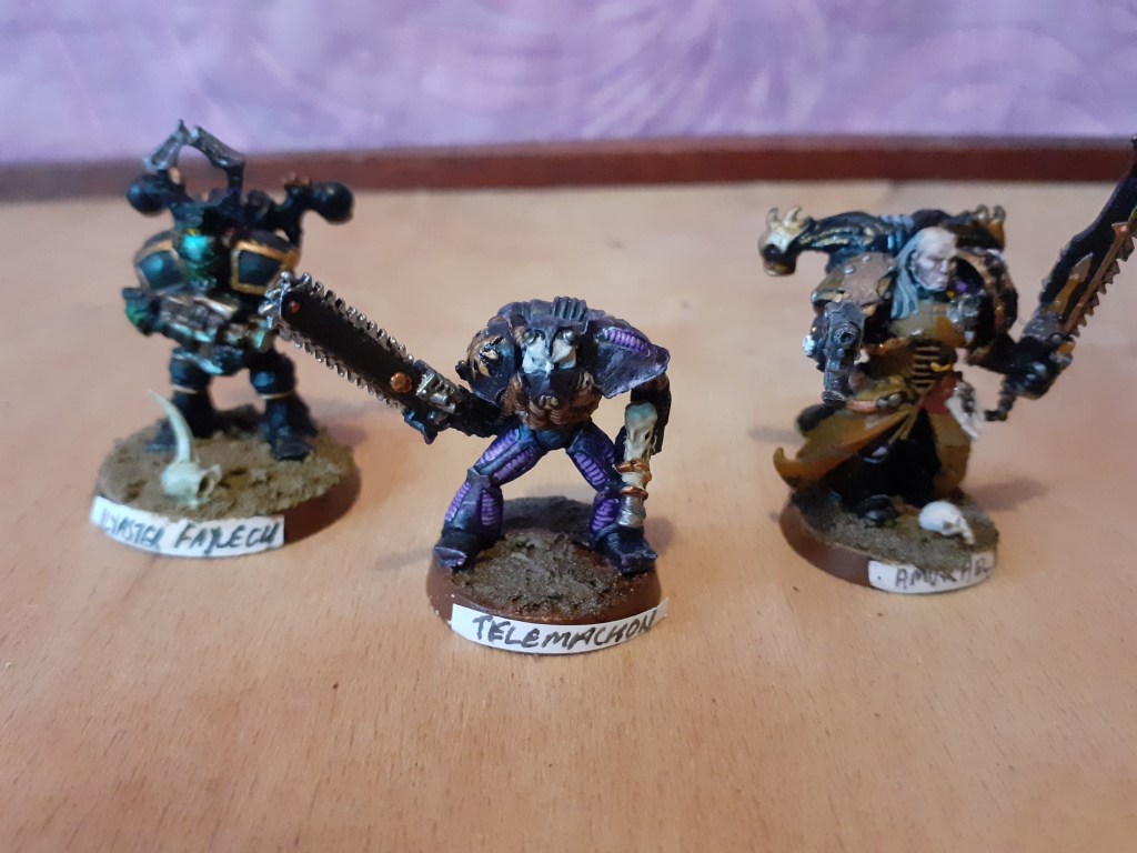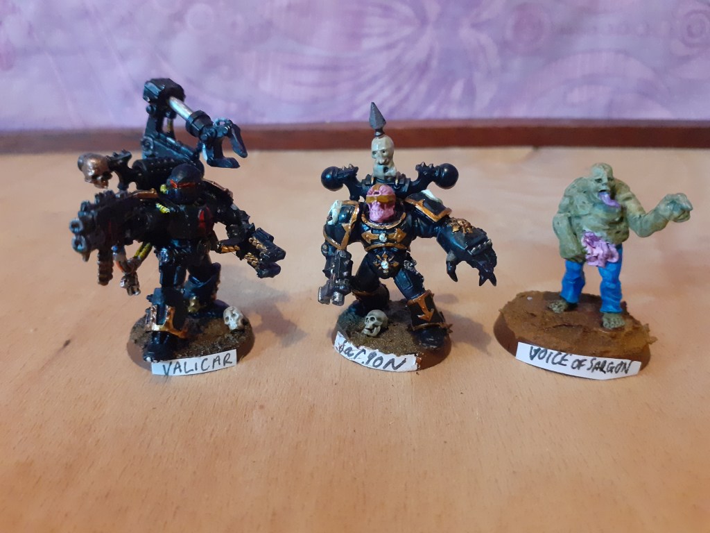 Iskandor is a Tzeentchian sorcerer, painted in blacks and dark blues, with sword and staff. The magic hands carrying him into battle were a right pain but I hope show him as a battlemage moving into battle. Nefertari is a Hasslefree elf, whilst Gyre is a wolf from a box of animal companion miniatures I bought a few years back. Ashur-Kai I chose a bird-headed sorcerer because of his affinity for birds. Like the Rubricae his black paintjob offers hints of the former bright-blue. Abaddon is Abaddon, though his sword is a parts-swap. Falkus has hints of Abaddon about him, his lightning claw references the Talon of Horus, but his mutations show that he is Possessed. The daemon Nagual miniature was chosen because its lots of animals, and Nagual was said to take many animal forms. The Ragged Knight is a fan-sculpt of the Hero Quest Gargoyle, itself based on the first version of the Bloodthirster. Tokugra, well, I liked the miniature, though I can’t remember where it comes from. Ilyaster, Telemachon, and Amurael are all vintage Chaos Space Marines, which is conceptually accurate. Ilyaster was a Death Guard, and his mini feels like a solid infantry slogger, with antler-esque horns and a face that reminds me of Nurgle. Telemachon was a swordsman of the Emperor’s Children, and his mini is lithe, ribbed, and preparing to use that chainsword. Amurael is an apothecary, so it seemed fair to use the only chaos apothecary miniature in existence, but without the bits that make it Fabius! Valicar was an Iron Warrior, so the Iron Warrior Captain miniature made sense. Sargon was a Word Bearer, but it was his damaged voicebox and zombie voice that really stood out. I thought that this head, with its sewn-up lips and blindfold, would do the job. The zombie miniature came out of the pile and I liked its pointing fingers, this is no mindless shuffler but a creature being controlled and animated. Note that both characters are pointing with the same arm. The Zaidu and Vortigern minis aren’t a good photo, sorry. Zaidu was a Night Lord, so I picked a spiky mini, and I felt that the unhelmed head would help me because I could do a skull mask on it. The maul had broken off, but that enabled me to fix it differently – a chainglaive is a very Night Lords weapon. Vortigern was a Fallen Dark Angel, so I wanted something vaguely knightly and the big sword, full armour and chainmail loincloth both worked. He also has a plasma pistol, a very Dark Angels weapon. Both these minis are from the Sixth Edition box set, some of my favourite Chaos Marines. For the former World Eaters Lheorvine, Delvarus, and Ugrivian I needed Khorny minis and found some vintage Berserkers and a vintage Possessed for Delvarus. Lheorvine needed a bit of work to find the right heavy weapon arm, but I got there eventually, I think that is from an early metal Havoc. Finally the mortal contingent. Ceraxia was a mini I bought on kickstarter years ago and was an absolute nightmare to build because there were so many fine parts. Ultio, well, the cyborg version of the Vengeful Spirit’s machine-spirit seemed an obvious choice of the Space Crusade Chaos Android. Tzah’Q was a beastman so I used one from Blackstone Fortress, and Moriana is another kickstarter mini, a witch whose staff-hand needed extensive pinning. And that’s it! I hope you enjoy them.