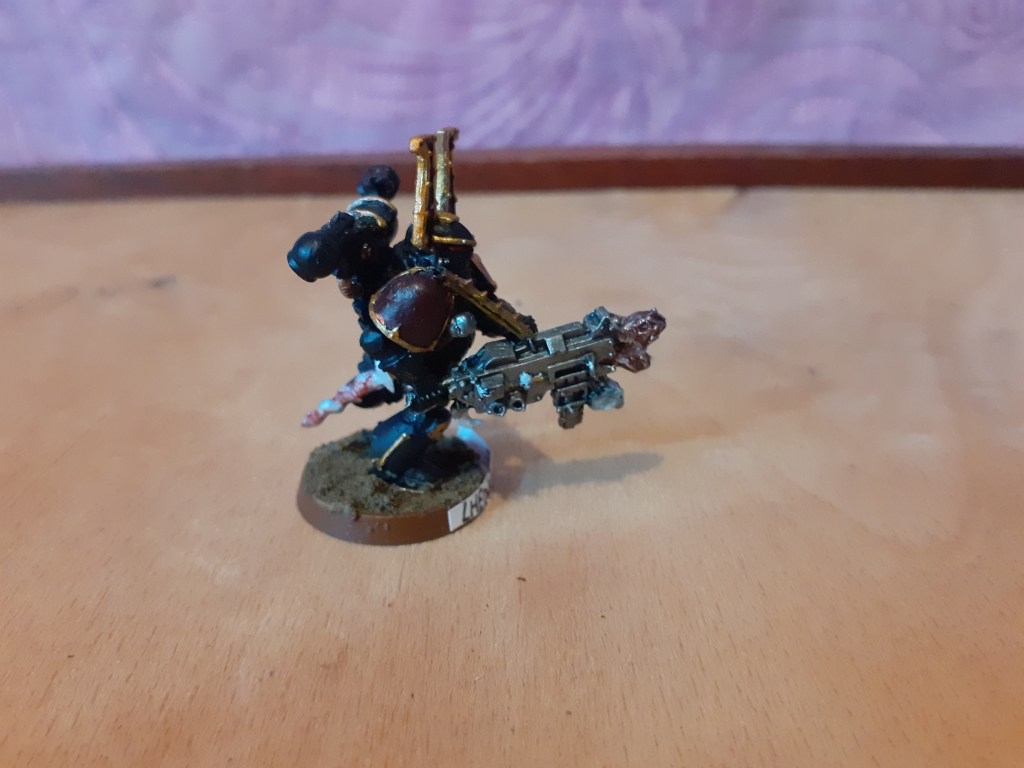 Here we are nearly four months since my last completed miniature, what have I been doing all this time? Well, I’ve been working on a project that has been rattling around my brain for a few years now. I really enjoyed Aaron Dembski-Bowden’s Black Legion books, which tell of the creation of the Black Legion from the ashes of the Sons Of Horus. The Black Legion will take any Chaos Space Marines who feel drawn to Abaddon’s big project, so it includes former members of the other Legions who are now wearing the colours of the Black Legion. This offers some fun modelling and painting prospects, the chance to try and create a unified look using disparate models. I have not attempted to create the models by slavishly following the descriptions in the book, because that’s not my jam, but I have to make them conceptually relevant by using miniatures and parts that I feel represent the characters in the novels.