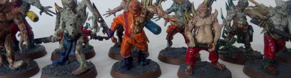 Finally finished these tricky bleeders.  I’m not very happy with them.  Like the Death Guard, they are lovely minis that I think really encapsulate the Nurgle plague zombie look.  They are heavily detailed, and you can see by looking at them how much time the poor sculptors must have spent looking at icky pictures of diseases and weird infections and gross skin conditions.  But they are blinking hard to paint.  There’s just so much there, so many different textures, so many tiny details.  In the end I had to accept that there is only so much a boy can do!