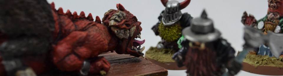 What a lovely experience it was, painting this little warband of Chaos Dwarfs. The wonderful bumcannon monster is by Old School Miniatures, in homage of course to the legendary limited release bumcannon of yore. The tenderiser is mostly the original, though missing its shield and the lower half of the daemon pushing it. I replaced that with an old plastic boar. The chap with the lobster arm is from Hasslefree, whose sculpt is clearly based on the dwarf Yorri from an illustration in (I think) Ignorant Armies.