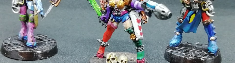 These minis are tricky. They were tricky to put together, at least the heads were – I often found that I didn’t have the fit quite right. They were tricky to paint, so many fine details and textures were very challenging. They took months of gradual work just to get them to look this average. Mad Donna, she was the last one started and the first one finished. Still, I learned a lot about colour and clashes and what does and doesn’t work. I wanted them to look like a discordent swirl of colours, clashing and complementing each other, and I think I succeeded in that.