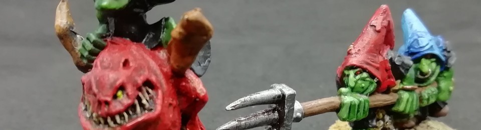 A little warband of gobbo / grotz / nasty green buggers that I put together for Mordheim or Warhammer Underworlds or one of those games that I don’t play 😀 As you can probably guess, I rummaged through the lead-pile and painted all sorts of things. Grotbagz herself, and the gobbo champion with the wolfskin and axes, I think they’re Knightmare miniatures and they are lovely. The mushroom rider is from GW’s wonderful Gobbapalooza kit that came out this year. There’s a squig-rider and squig-herders from WHFB 4, a resin goblin that I can’t place or recall ever buying or being giving, some snot-goblins that came from a kickstarter possibly with a lead chimera, and a snotling from Warhammer Quest 1. Quite a collection of misfits!