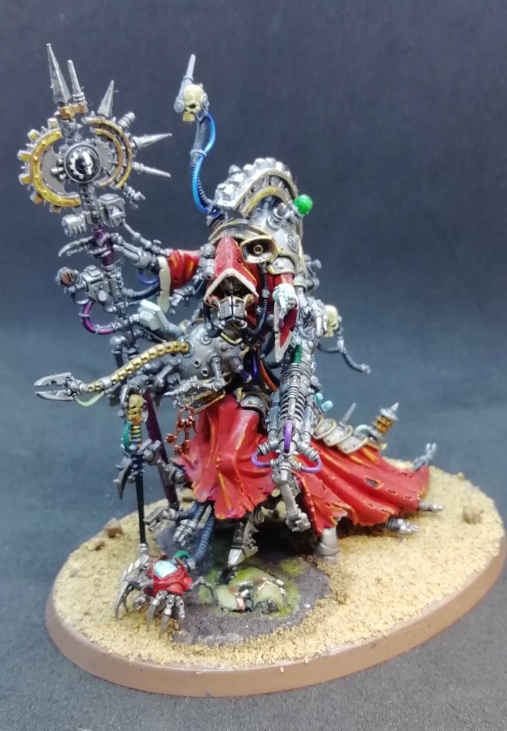 I love John Blanche’s work in all mediums, and have done since I discovered it – I did my GCSE art written project on John Blanche’s drawings, all the way back in 1994, and I bet I’m not alone in that. I have a particular love for the whole Blanchistu thing and whilst I’m no great painter I’ve wanted to have a go for some time. My first attempt was the Dark Mechanicum squad I posted last year, but somewhere along the way I lost confidence and fell back into old ways. This time I have looked at more models, done some research, and thrown myself into it. I am pleased with the results. Not White Dwarf standard by a long shot, but a good start. Next time will be a bit better. If you’ve got a squad of cultists that have been on the path too long and whose humanity is starting to degrade, then they need a leader who aspires to greatness, whose mutations are more pronounced and less debilitating, and who, maybe, glows with an eerie light! Eagle-eyed viewers may note that he is snapped at the knees and has been glued to that gravestone in order to give the illusion of completeness… this is because my mini was bent and my attempts to fix it were spectacularly unsuccessful. There was some swearing that day, I can tell you.