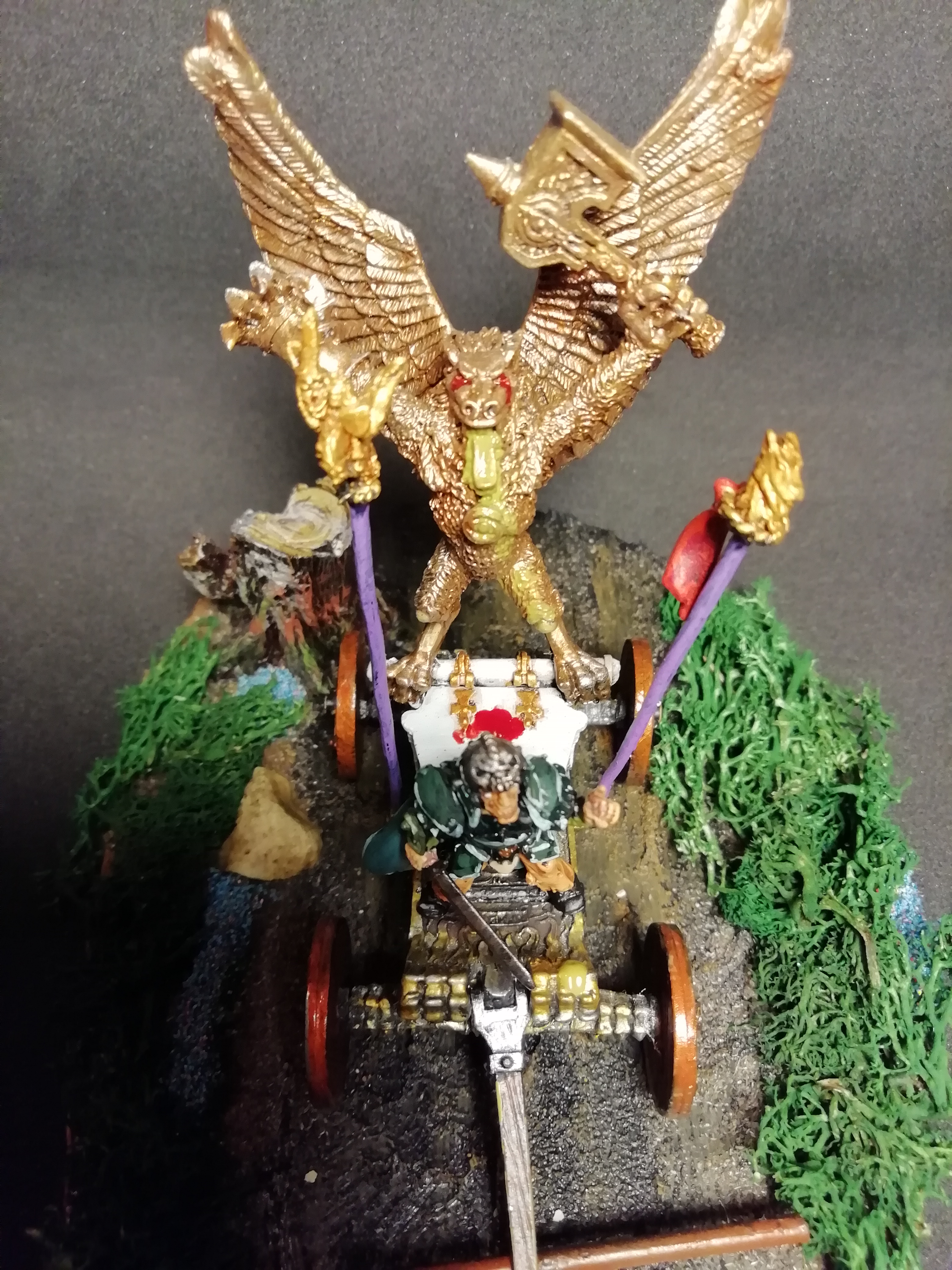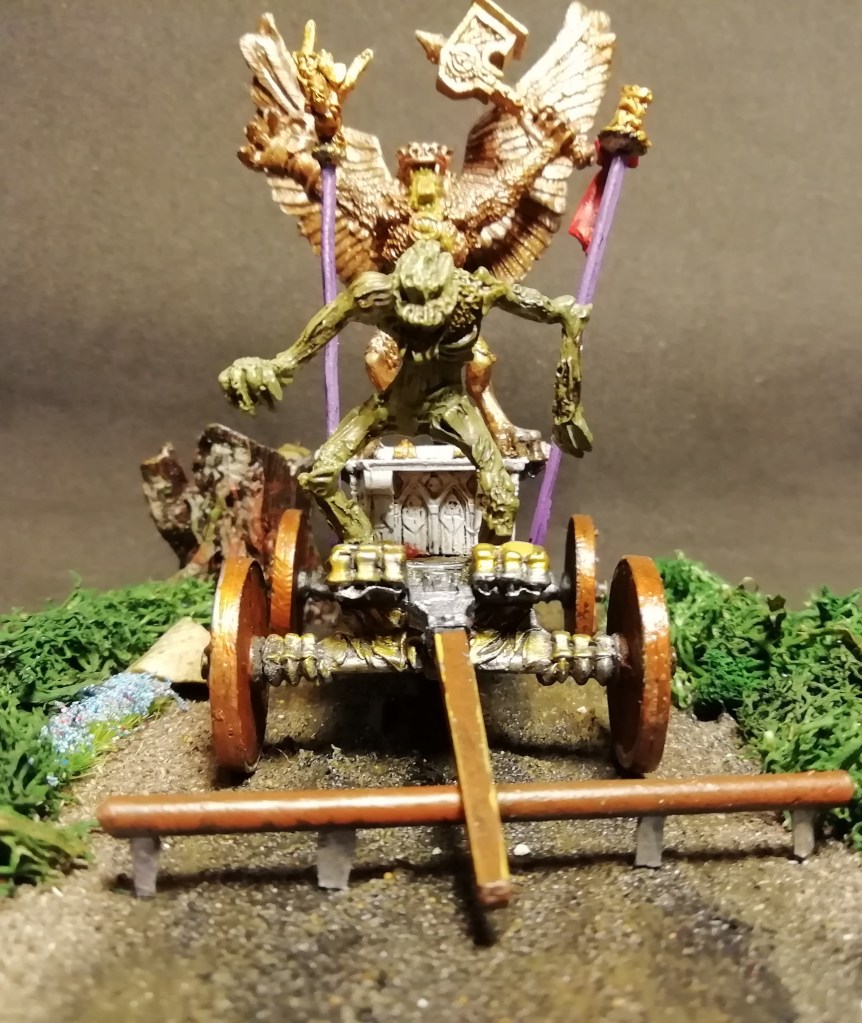 This is a bit of a one-off project that I painted for the hell of it, though I suppose that over the last few years I’ve probably painted enough fantasy squads that I could put together some sort of Chaos army, especially if you consider all the Battle Masters stuff… which reminds me, I must finish that sometime. Yeah, a chaos army would definitely work, some beastmen, chaos knights, I’ve got some plaguebearers and some pink horrors, some tzeentch wizards, some chaos dwarf artillery. that would make a good army. Anyhoo, when I pulled a war alter out of the leadpile, I struggled to think what to do with it. It was incomplete, missing a horn, and I considered trying my hand at sculpting but in the end decided that it would be more fun to tell a story with it.