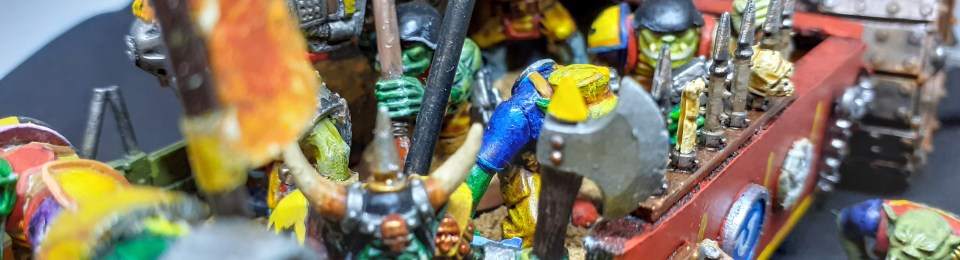I know I said I was done with Bad Moonz when I finished the Oddboyz, but I felt that just a Bigmob wasn’t really Orky. You need at least one more of the same colour in there. So here it is! Actually, the mob was kind of built to go in the battlewagon. This battlewagon came in a job lot and was pretty mullered. I rebuilt it and extended it and added a few bits. It looks alright but I was too basic with the side panels, I should have put more spikes around the edges and made the sides look like they were made up of different panels welded together. This wouldn’t have been difficult to do, but I didn’t do it because it didn’t occure to me until I was already painting and think, this could look better, and then I didn’t stop and redo it because Orkes don’t look back. I love the old battlewagon model, and I hope that this isnt the last time I get to build and paint one. Maybe when I win the lottery I will buy one for every ork mob I make!