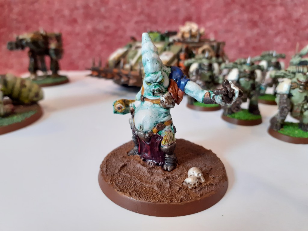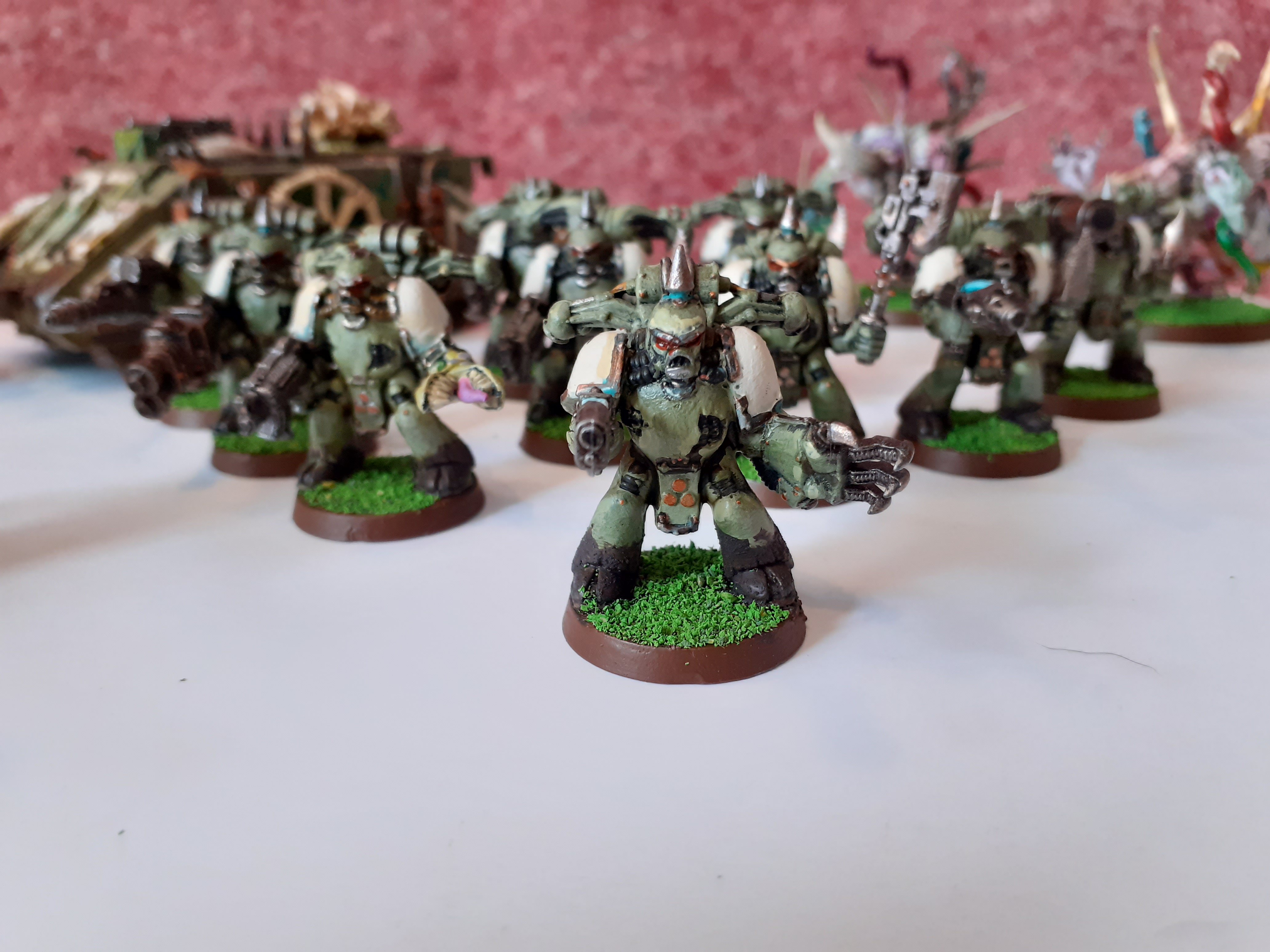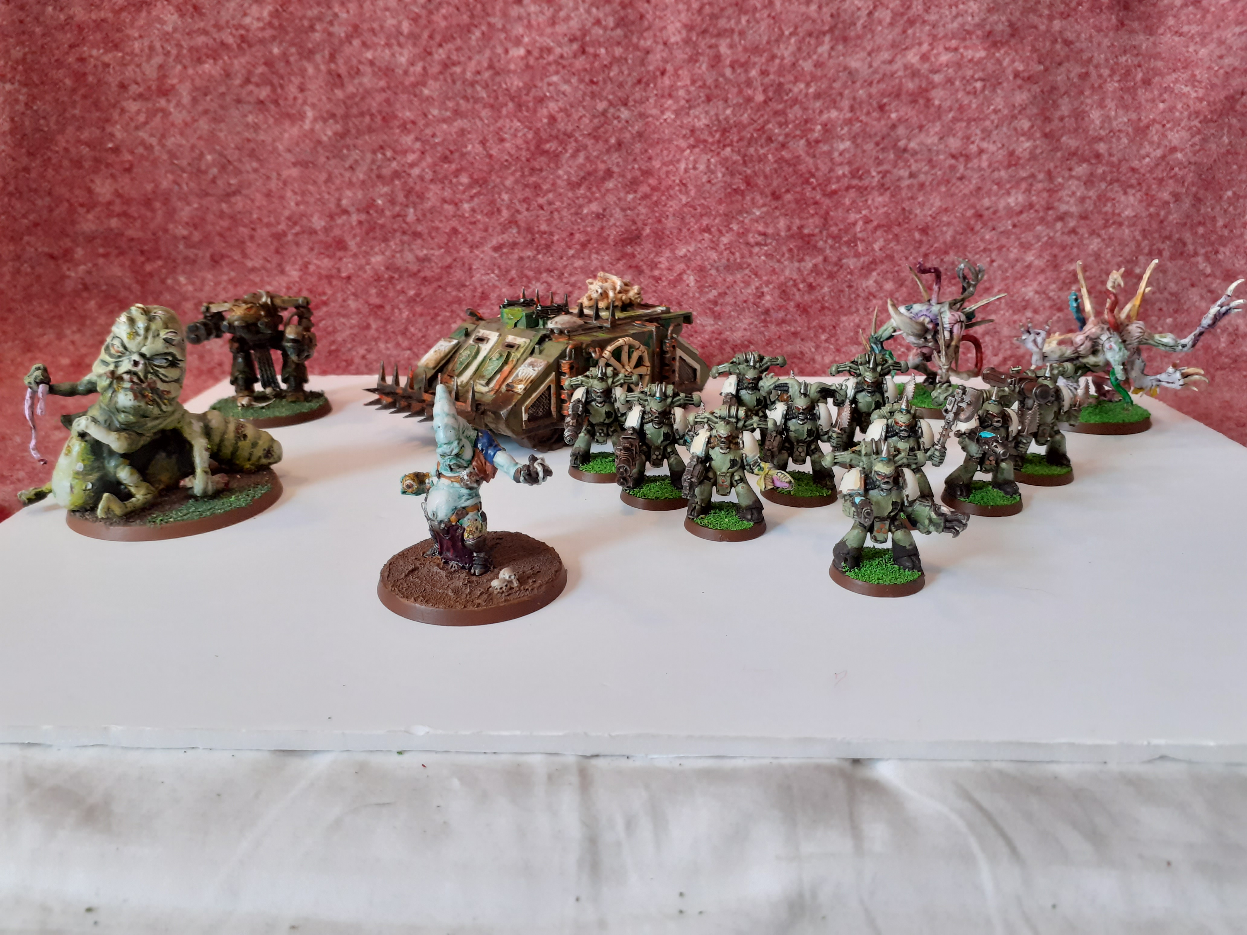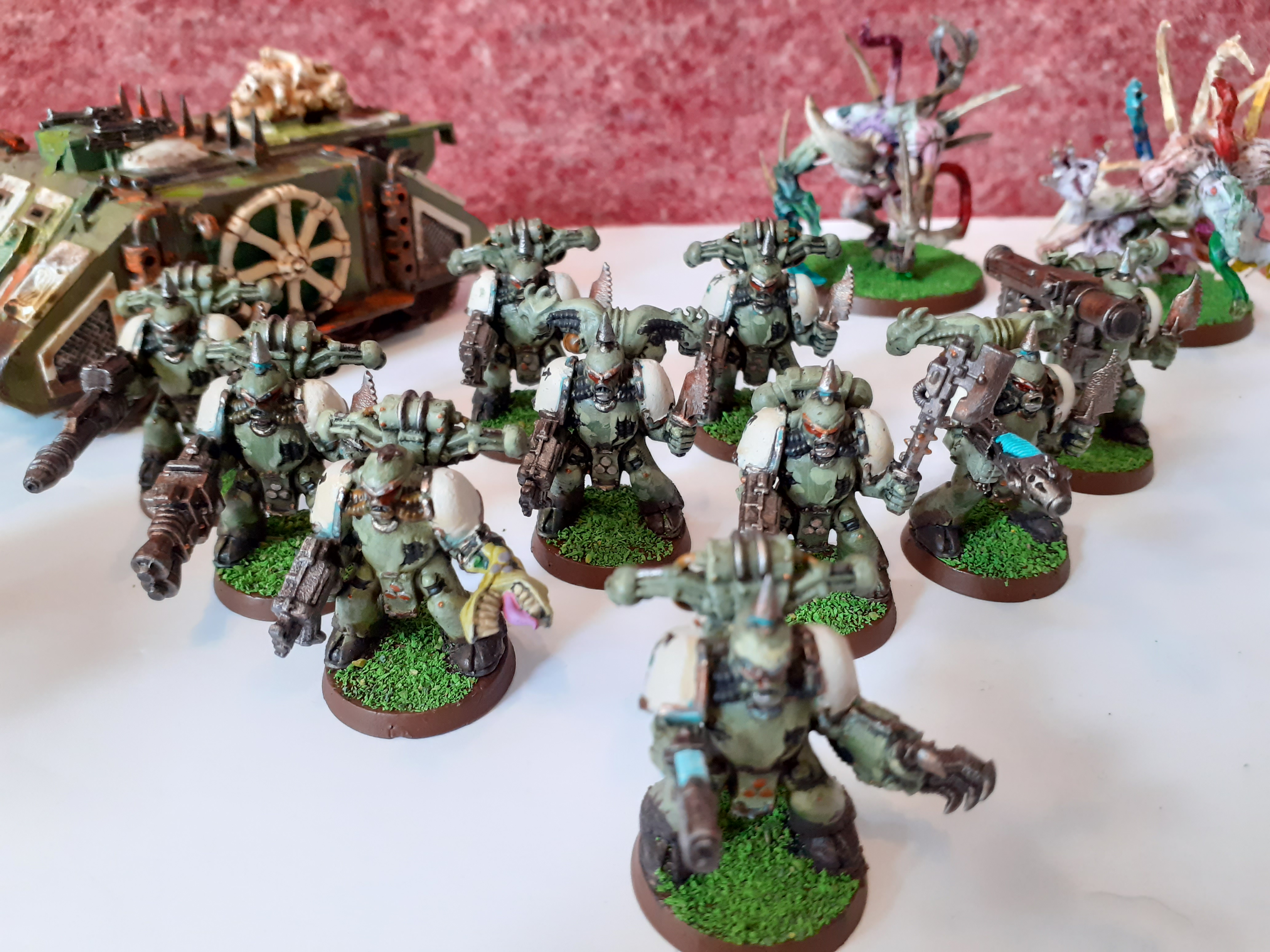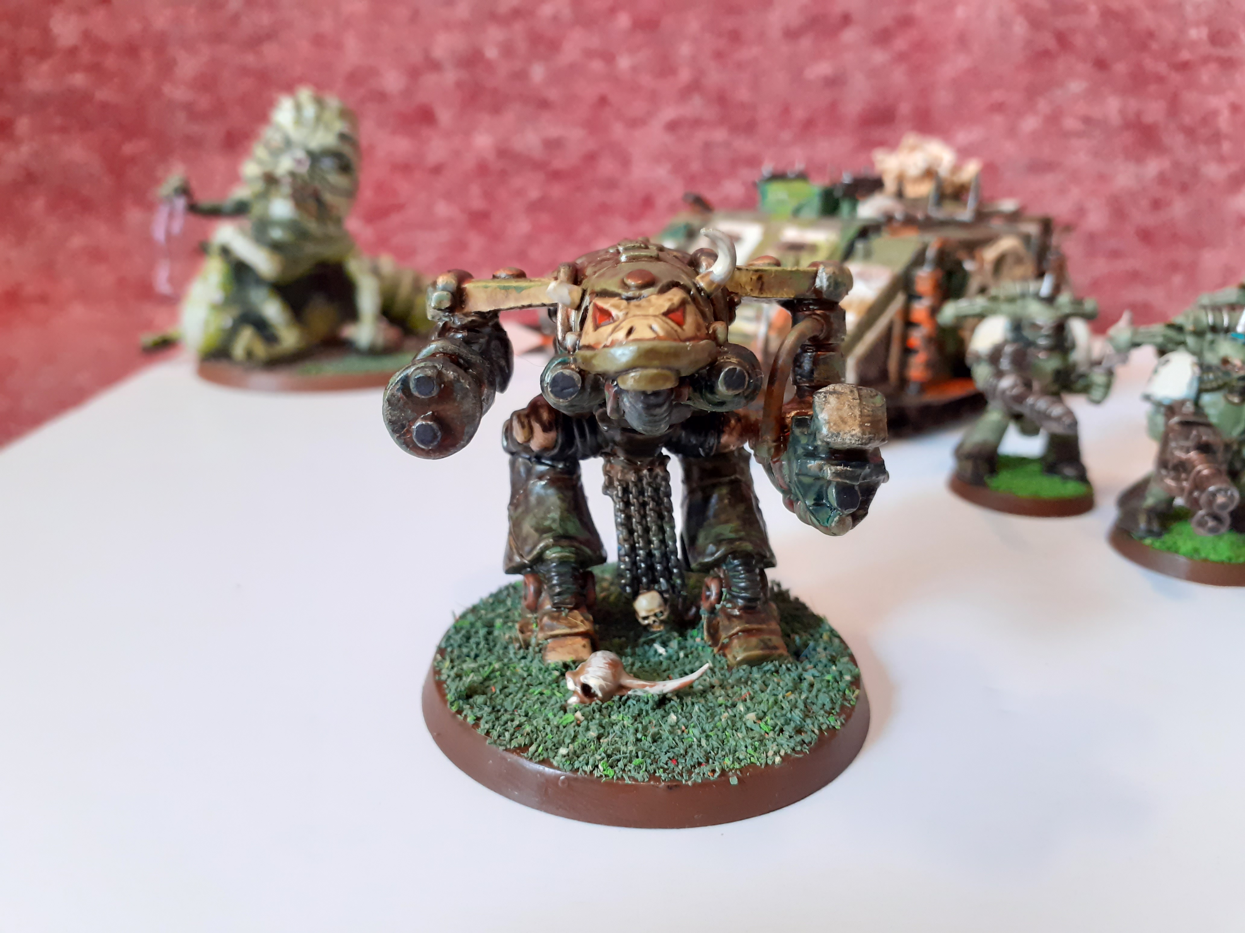 I’ve been sitting on these for months waiting to have the time and energy to post. This horrible bunch are Fibrius Clustor and his warband. We’ve got Fibrius himself, which came from a Kickstarter, and is a lovely miniature. Fibrius could be a daemon prince, the magic using leader of a Plague Marine army, or a powerfully mutated human cultist well on the path to ascention. Then there is the big tube creature, from the same Kickstarter. These two are beautiful and were a joy to paint. Big Tube can be a Greater Daemon, a spawn, a daemon prince, or perhaps a Beast of Nurgle, depending on my feels. Up next we have some Oldhammer goodness, a Rhino and some original monopose plastic Plague Marines. The Rhino had already been converted towards Nurgle, I just tidied up the conversion a bit and repainted it. The Plague Marines are pretty limited but I made some conversions. In theory these are table legal in 10th edition, with a Plague Spitter and Plague Weapons modelled in addition to the missile launcher (Plague Launcher?) and flamer (Plague Flamer, i dunno). I think that they’ve come out alright considering how shonky the minis are. I hated them at the time because the Realm of Chaos branded Chaos Marines were so good and these are so basic. But they’re a step on the path that led us to where we are now, with amazing Plague Marines. The final bits of this warband I am not so happy with. Firstly, Newhammer Chaos Spawn, which were tricky to paint and unrewarding. In the end I did lots of layers of different shades to try and get a dusky bruised and rotting effect. This wasn’t especially successful. Finally a fansculpt Space Crusade style dreadnought. This was difficult to paint mostly because the sculpt is a bit of a stinker. It looked alright on screen but it doesn’t fit together well at all, and the detail is scrawled on with a point, and where it is sculpted on its pretty basic and has fingerprints in it and generally looks like a beginner’s piece. We all need to start somewhere, and I am happy to support enthusastic amateurs. It’s just hard to get a piece like that looking good, especially with my limited skills.