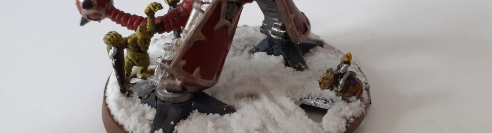 The title says it all really. This Warlord was kicking around in my pile of potential and I thought I had better paint it up. Picking a colourscheme randomly from lexicanum’s list of traitor titan legions (it had to be a traitor because, well, it is a traitor, just look at it). I think this is the third old Warlord I’ve painted. One of the most fun things about painting things in different scales IMO is that you can use the bases to tell stories in ways that are much harder in 28/32mm. So here we have a brave knight facing off against some nasty plaguebearers… My favourite bit about this was adding the whipping tentacle coming out of one of its weapon mounts. I tried to make it look fleshy!