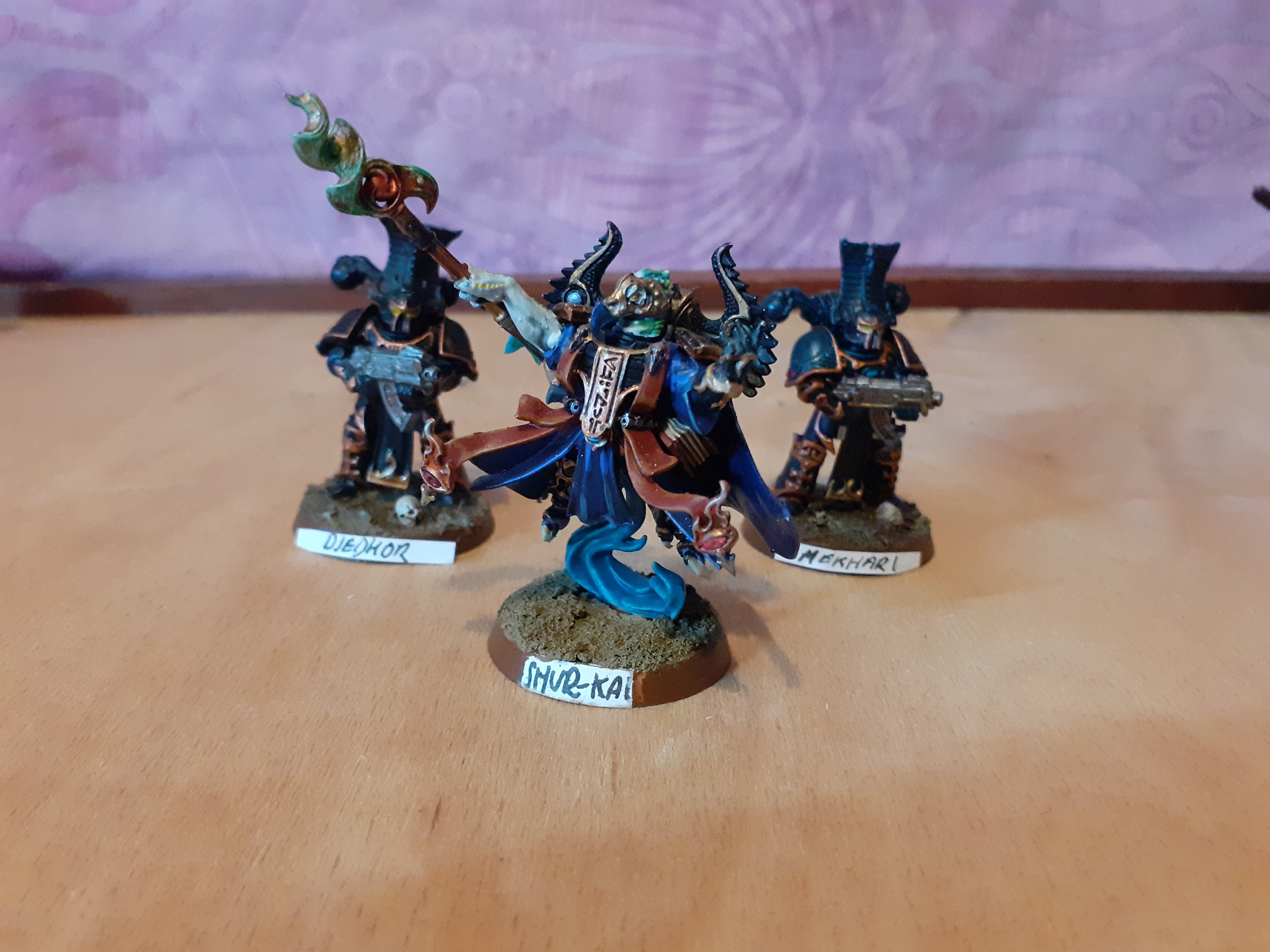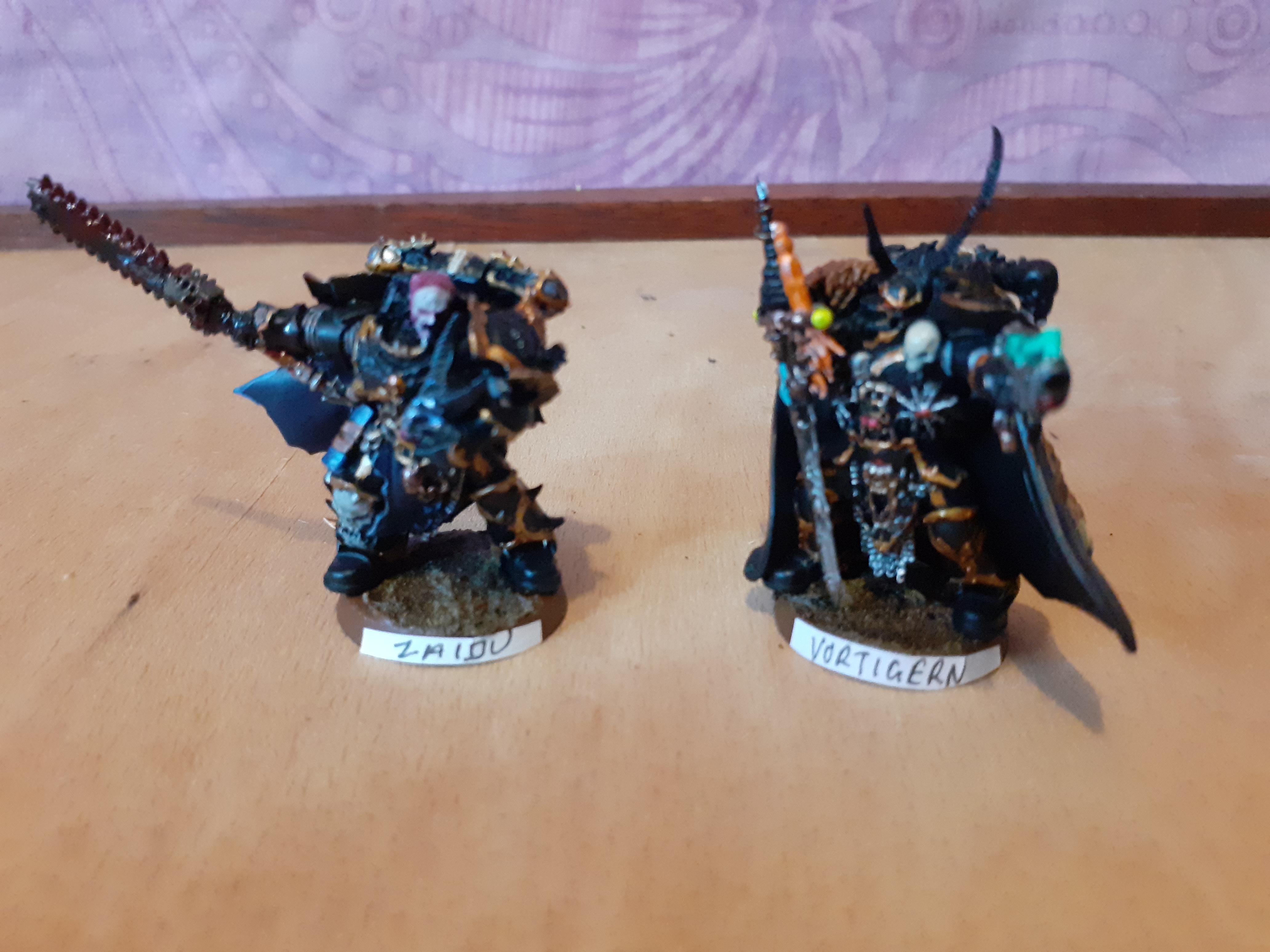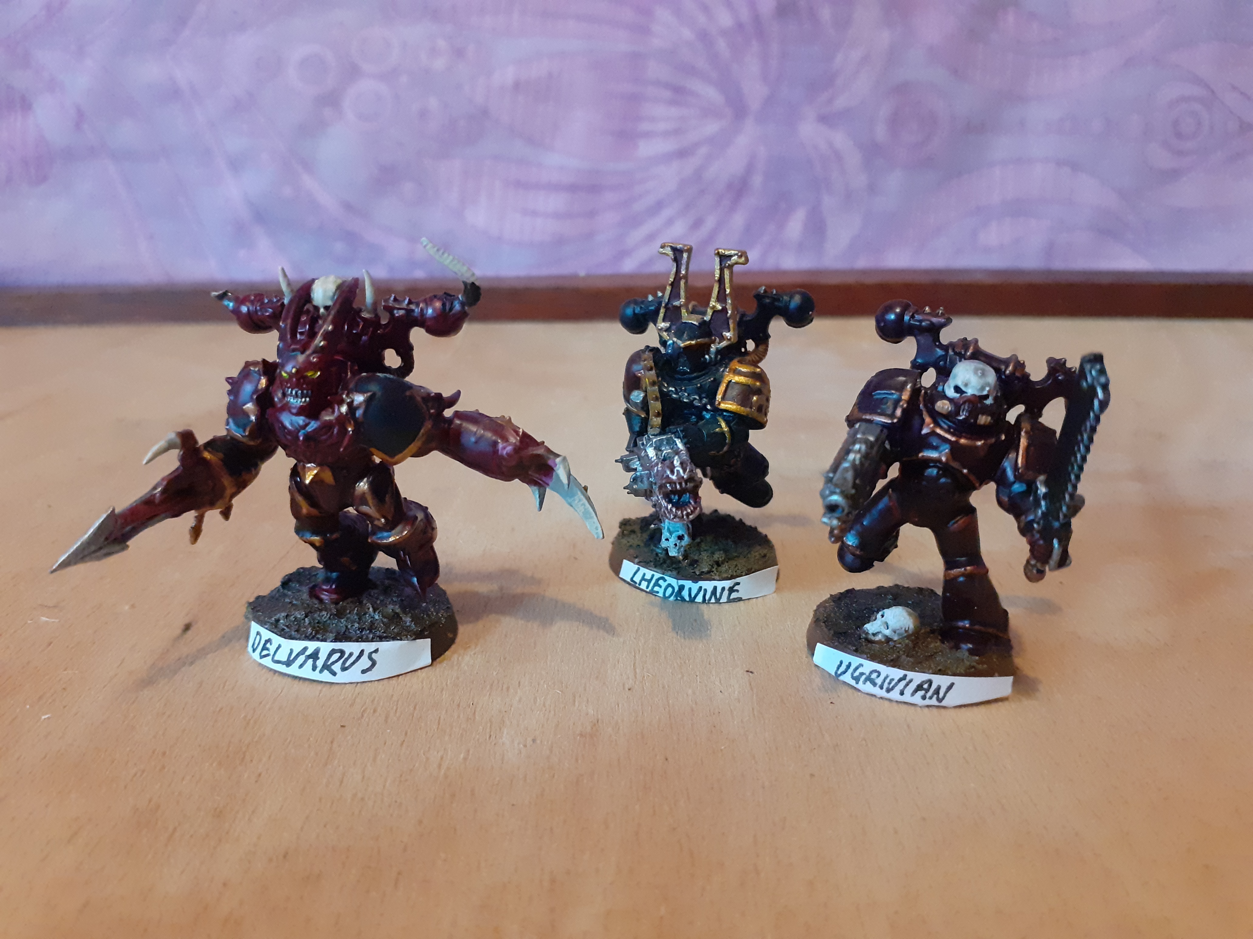 Iskandor is a Tzeentchian sorcerer, painted in blacks and dark blues, with sword and staff. The magic hands carrying him into battle were a right pain but I hope show him as a battlemage moving into battle. Nefertari is a Hasslefree elf, whilst Gyre is a wolf from a box of animal companion miniatures I bought a few years back. Ashur-Kai I chose a bird-headed sorcerer because of his affinity for birds. Like the Rubricae his black paintjob offers hints of the former bright-blue. Abaddon is Abaddon, though his sword is a parts-swap. Falkus has hints of Abaddon about him, his lightning claw references the Talon of Horus, but his mutations show that he is Possessed. The daemon Nagual miniature was chosen because its lots of animals, and Nagual was said to take many animal forms. The Ragged Knight is a fan-sculpt of the Hero Quest Gargoyle, itself based on the first version of the Bloodthirster. Tokugra, well, I liked the miniature, though I can’t remember where it comes from. Ilyaster, Telemachon, and Amurael are all vintage Chaos Space Marines, which is conceptually accurate. Ilyaster was a Death Guard, and his mini feels like a solid infantry slogger, with antler-esque horns and a face that reminds me of Nurgle. Telemachon was a swordsman of the Emperor’s Children, and his mini is lithe, ribbed, and preparing to use that chainsword. Amurael is an apothecary, so it seemed fair to use the only chaos apothecary miniature in existence, but without the bits that make it Fabius! Valicar was an Iron Warrior, so the Iron Warrior Captain miniature made sense. Sargon was a Word Bearer, but it was his damaged voicebox and zombie voice that really stood out. I thought that this head, with its sewn-up lips and blindfold, would do the job. The zombie miniature came out of the pile and I liked its pointing fingers, this is no mindless shuffler but a creature being controlled and animated. Note that both characters are pointing with the same arm. The Zaidu and Vortigern minis aren’t a good photo, sorry. Zaidu was a Night Lord, so I picked a spiky mini, and I felt that the unhelmed head would help me because I could do a skull mask on it. The maul had broken off, but that enabled me to fix it differently – a chainglaive is a very Night Lords weapon. Vortigern was a Fallen Dark Angel, so I wanted something vaguely knightly and the big sword, full armour and chainmail loincloth both worked. He also has a plasma pistol, a very Dark Angels weapon. Both these minis are from the Sixth Edition box set, some of my favourite Chaos Marines. For the former World Eaters Lheorvine, Delvarus, and Ugrivian I needed Khorny minis and found some vintage Berserkers and a vintage Possessed for Delvarus. Lheorvine needed a bit of work to find the right heavy weapon arm, but I got there eventually, I think that is from an early metal Havoc. Finally the mortal contingent. Ceraxia was a mini I bought on kickstarter years ago and was an absolute nightmare to build because there were so many fine parts. Ultio, well, the cyborg version of the Vengeful Spirit’s machine-spirit seemed an obvious choice of the Space Crusade Chaos Android. Tzah’Q was a beastman so I used one from Blackstone Fortress, and Moriana is another kickstarter mini, a witch whose staff-hand needed extensive pinning. And that’s it! I hope you enjoy them.