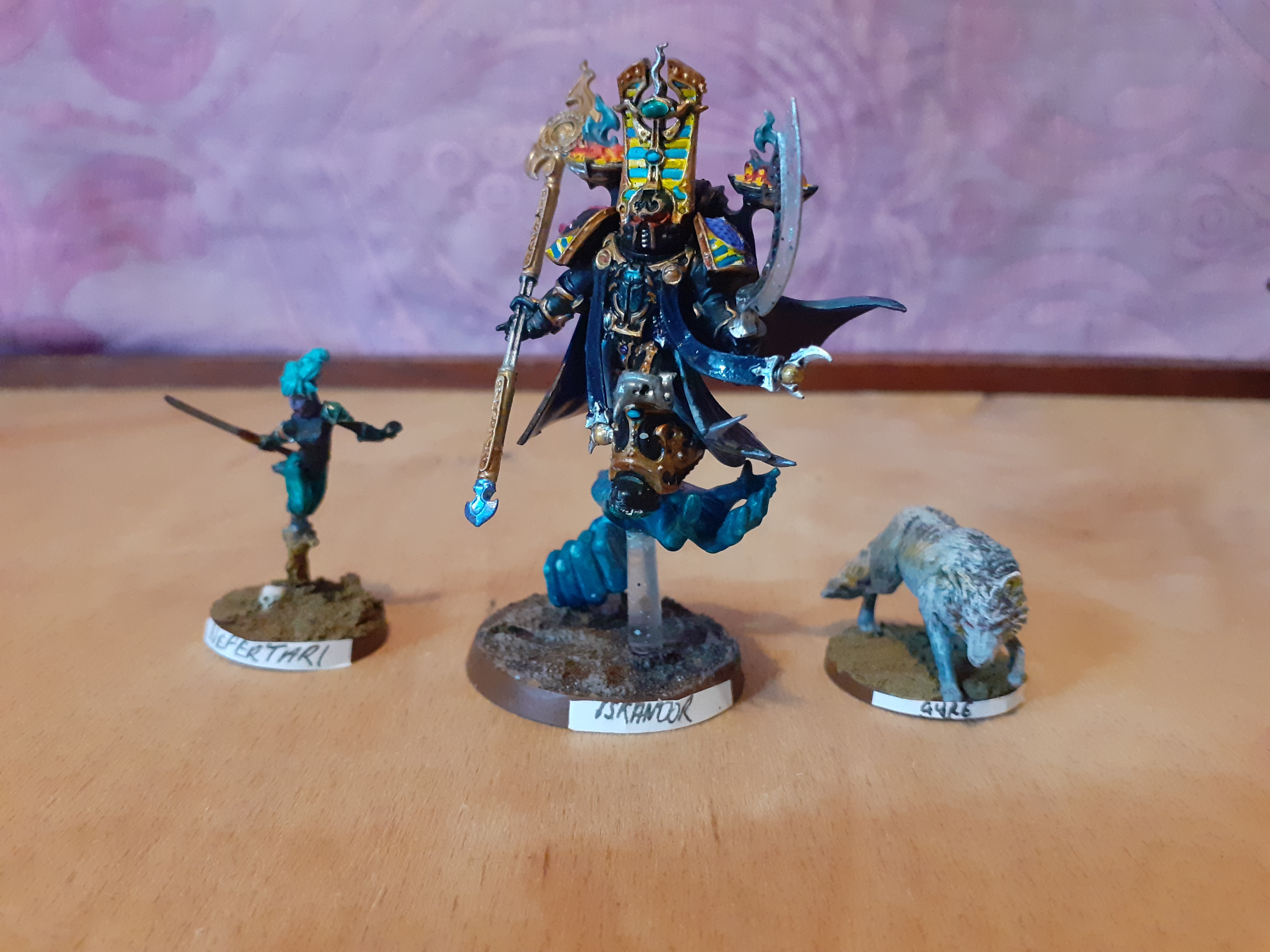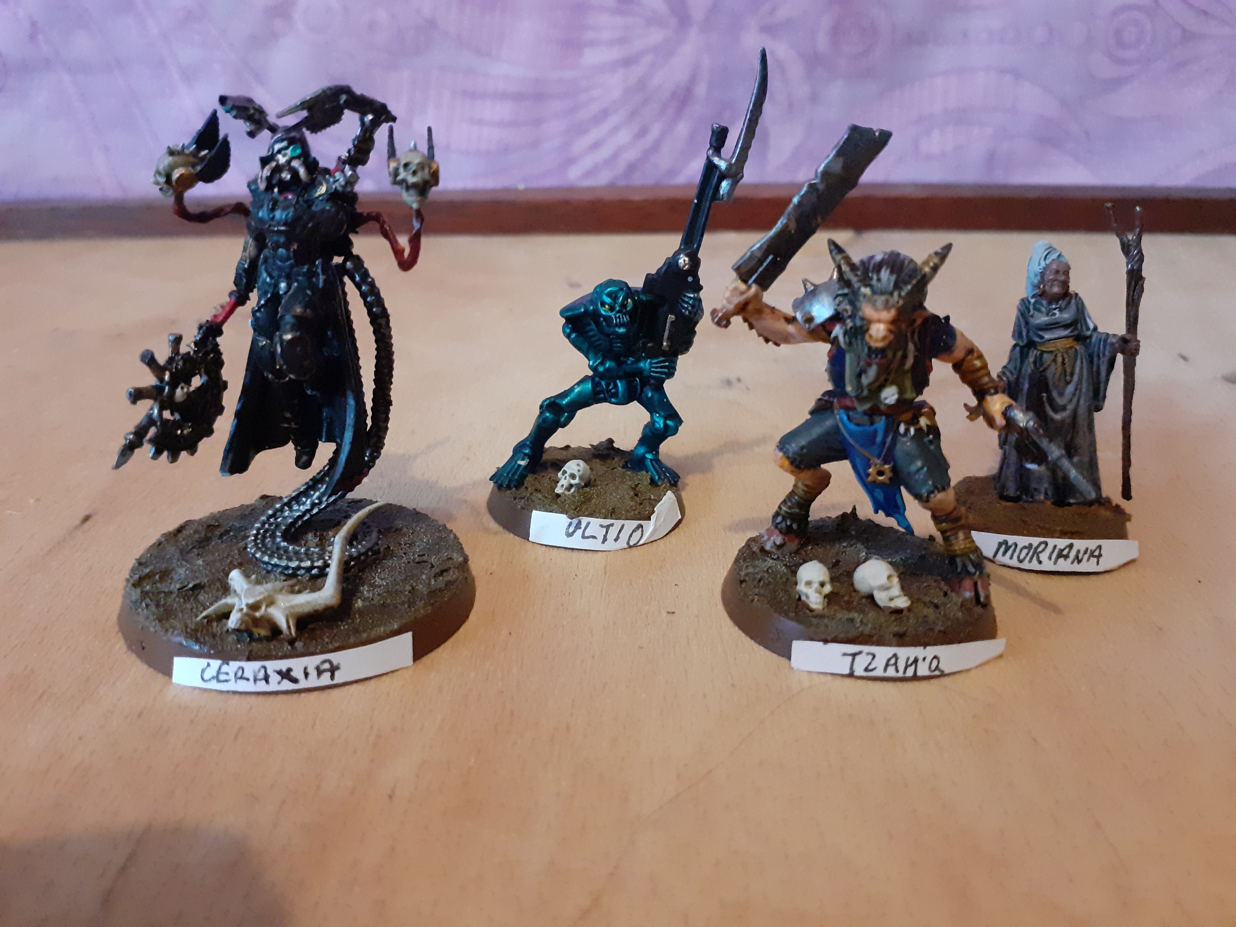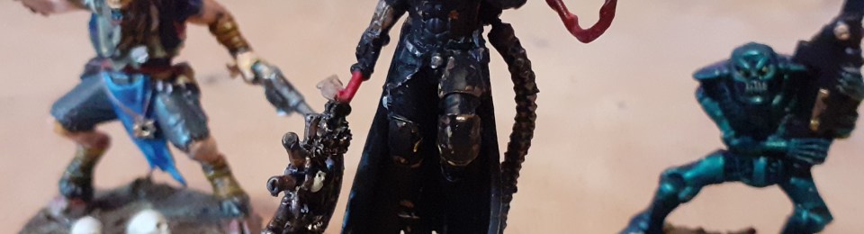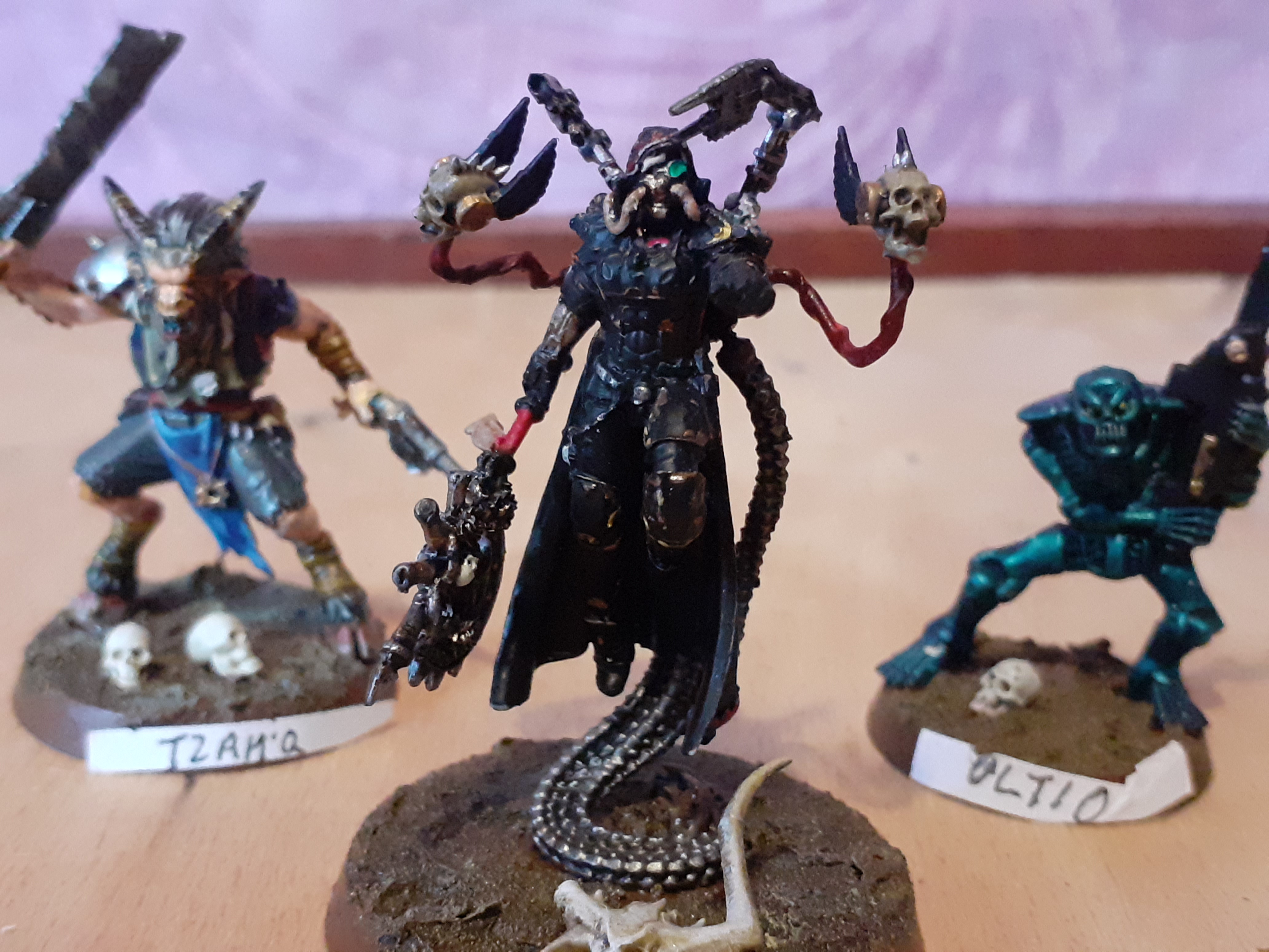 Iskandor is a Tzeentchian sorcerer, painted in blacks and dark blues, with sword and staff. The magic hands carrying him into battle were a right pain but I hope show him as a battlemage moving into battle. Nefertari is a Hasslefree elf, whilst Gyre is a wolf from a box of animal companion miniatures I bought a few years back. Ashur-Kai I chose a bird-headed sorcerer because of his affinity for birds. Like the Rubricae his black paintjob offers hints of the former bright-blue. Abaddon is Abaddon, though his sword is a parts-swap. Falkus has hints of Abaddon about him, his lightning claw references the Talon of Horus, but his mutations show that he is Possessed. The daemon Nagual miniature was chosen because its lots of animals, and Nagual was said to take many animal forms. The Ragged Knight is a fan-sculpt of the Hero Quest Gargoyle, itself based on the first version of the Bloodthirster. Tokugra, well, I liked the miniature, though I can’t remember where it comes from. Ilyaster, Telemachon, and Amurael are all vintage Chaos Space Marines, which is conceptually accurate. Ilyaster was a Death Guard, and his mini feels like a solid infantry slogger, with antler-esque horns and a face that reminds me of Nurgle. Telemachon was a swordsman of the Emperor’s Children, and his mini is lithe, ribbed, and preparing to use that chainsword. Amurael is an apothecary, so it seemed fair to use the only chaos apothecary miniature in existence, but without the bits that make it Fabius! Valicar was an Iron Warrior, so the Iron Warrior Captain miniature made sense. Sargon was a Word Bearer, but it was his damaged voicebox and zombie voice that really stood out. I thought that this head, with its sewn-up lips and blindfold, would do the job. The zombie miniature came out of the pile and I liked its pointing fingers, this is no mindless shuffler but a creature being controlled and animated. Note that both characters are pointing with the same arm. The Zaidu and Vortigern minis aren’t a good photo, sorry. Zaidu was a Night Lord, so I picked a spiky mini, and I felt that the unhelmed head would help me because I could do a skull mask on it. The maul had broken off, but that enabled me to fix it differently – a chainglaive is a very Night Lords weapon. Vortigern was a Fallen Dark Angel, so I wanted something vaguely knightly and the big sword, full armour and chainmail loincloth both worked. He also has a plasma pistol, a very Dark Angels weapon. Both these minis are from the Sixth Edition box set, some of my favourite Chaos Marines. For the former World Eaters Lheorvine, Delvarus, and Ugrivian I needed Khorny minis and found some vintage Berserkers and a vintage Possessed for Delvarus. Lheorvine needed a bit of work to find the right heavy weapon arm, but I got there eventually, I think that is from an early metal Havoc. Finally the mortal contingent. Ceraxia was a mini I bought on kickstarter years ago and was an absolute nightmare to build because there were so many fine parts. Ultio, well, the cyborg version of the Vengeful Spirit’s machine-spirit seemed an obvious choice of the Space Crusade Chaos Android. Tzah’Q was a beastman so I used one from Blackstone Fortress, and Moriana is another kickstarter mini, a witch whose staff-hand needed extensive pinning. And that’s it! I hope you enjoy them.