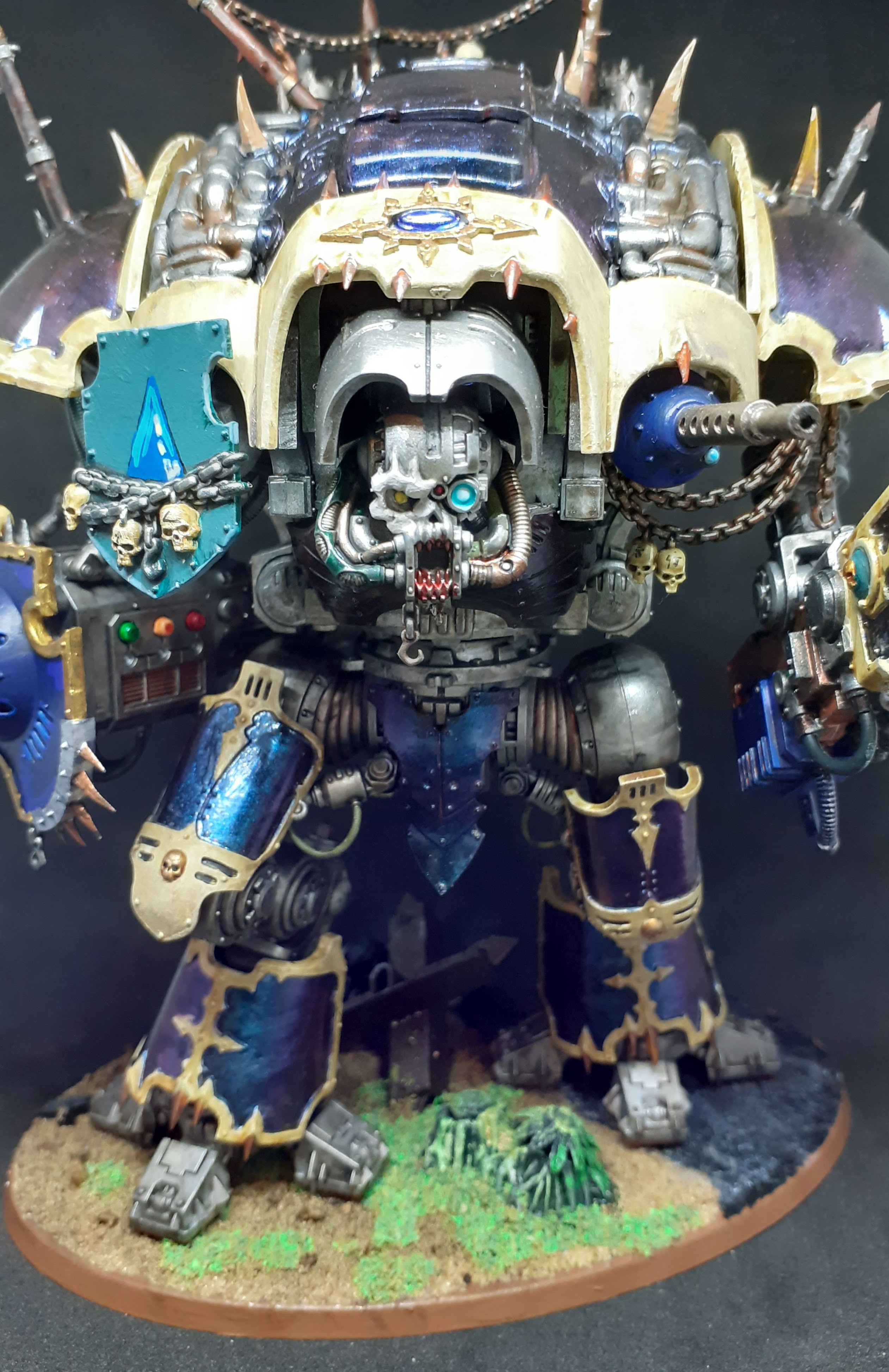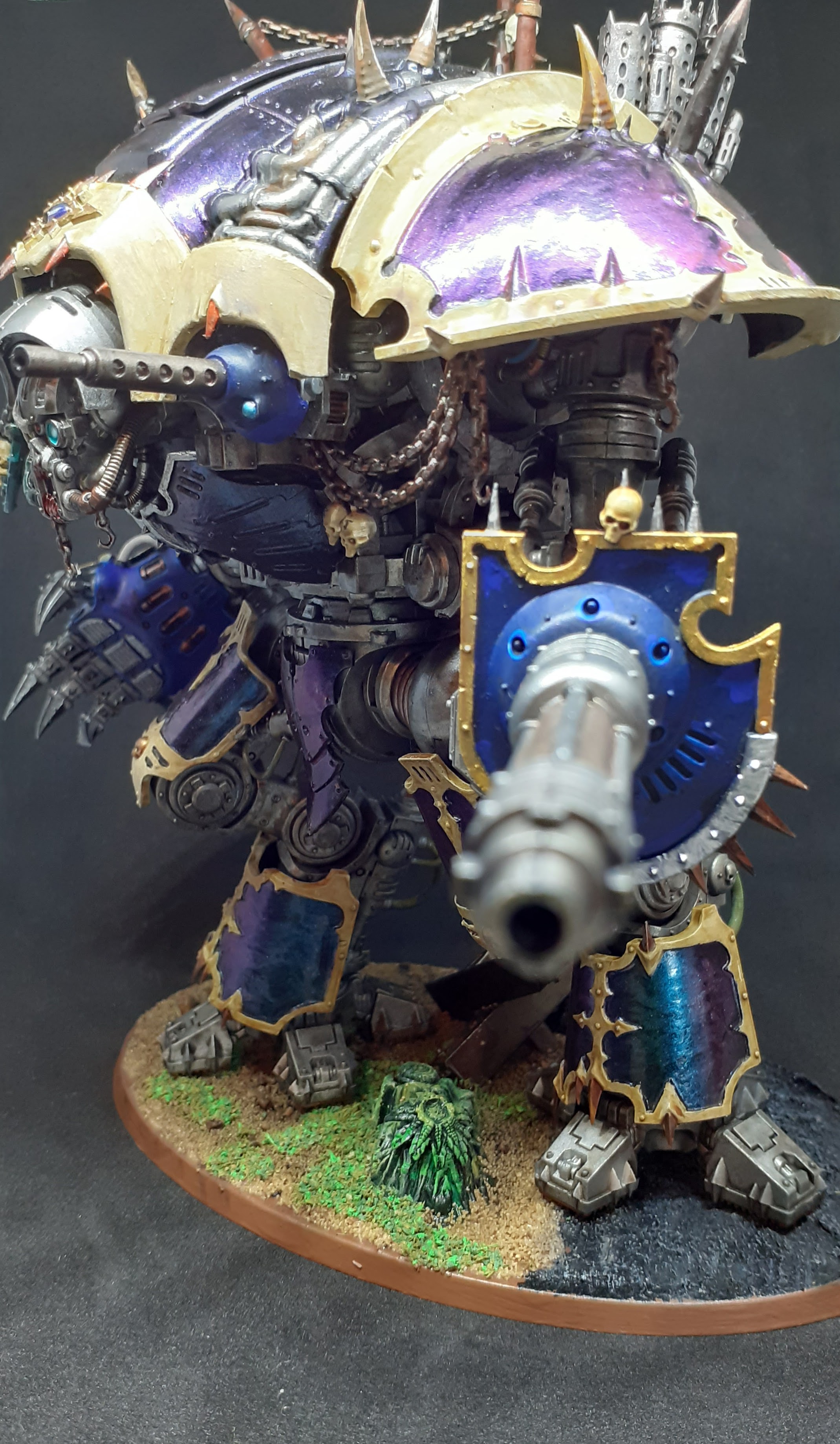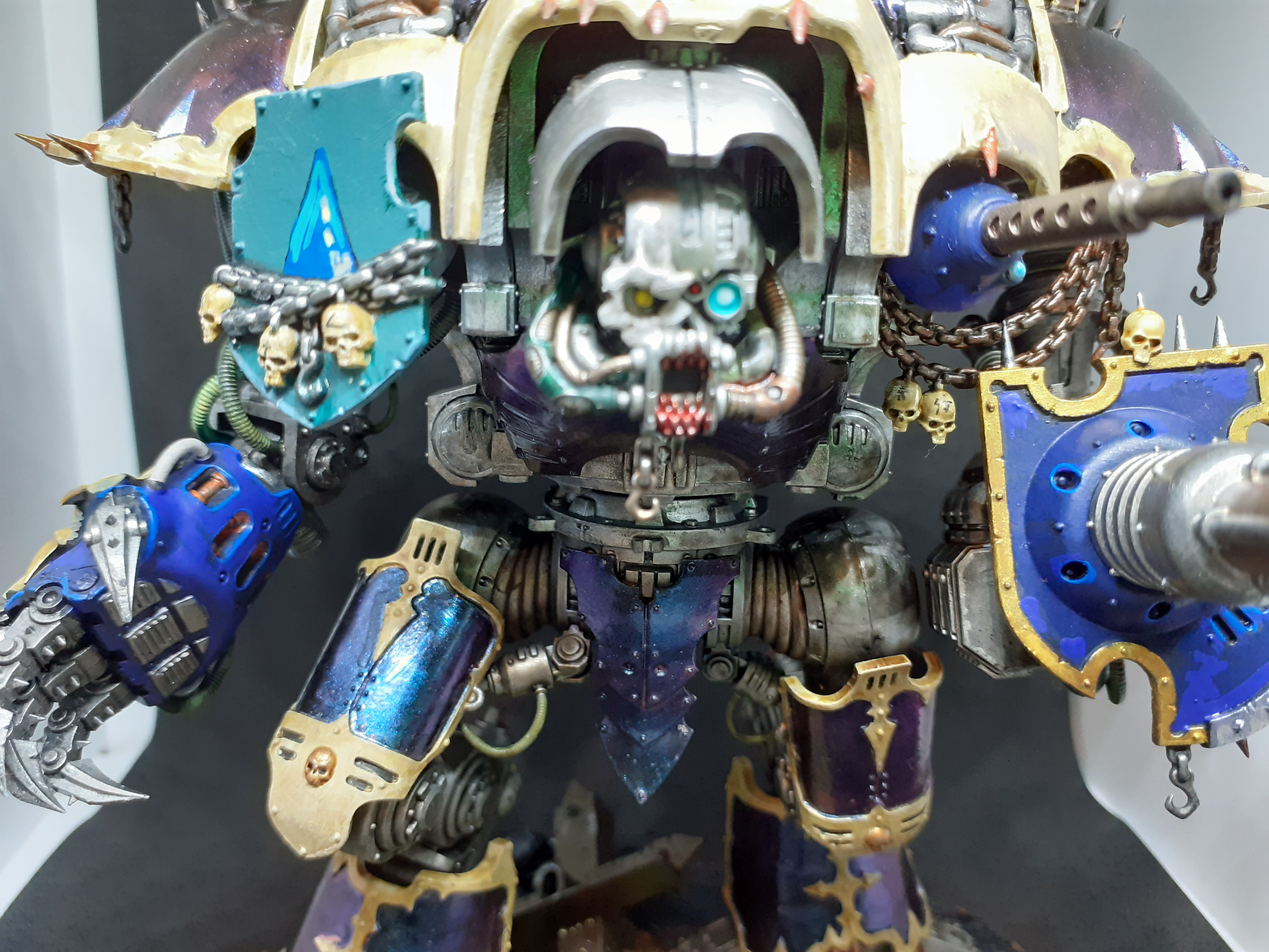 I had a load of GW vouchers and I wanted to get something that I would really enjoy building and painting and would look amazing and I vacillated between a Stompa and the Glottkin or maybe a Keeper of Secrets but I settled on a Knight for a number of reasons. One: its awesome. Two: Chaos lends itself to soup armies which are rubbish for playing beardy people (because of command points and all those other things that I don’t really understand but seem important these days) but seem very chaosy… you know, hordes of cultists backed up by some Marines and giant spiky death robot. Three: it looks fun to build and not too finicky to paint.Four: its awesome.