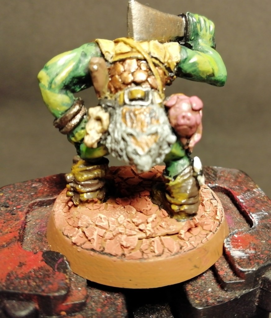 I forgot to post these with the trolls the other weeks. The trolls were to pull the chaos alter along, the magician / snot demon rides the alter, and these chaps were to be a roving defender or two. Basically I wanted one champion for fantasy and one for sci-fi. The fantasy chap has been painted as an Orc but I think he’s a Ogre. I’m not sure what range he’s from. Nice vintage mini though, with the funny hunched stance you often see on older miniatures. The sci-fi chap is from Ramshackle Games, I think. Its a very rough sculpt, you can’t quite see the fingerprints but you can see the marks from the sculpting tools. That’s not a bad thing or a criticism or owt, because it feels right for something Nurglish. Enjoy!