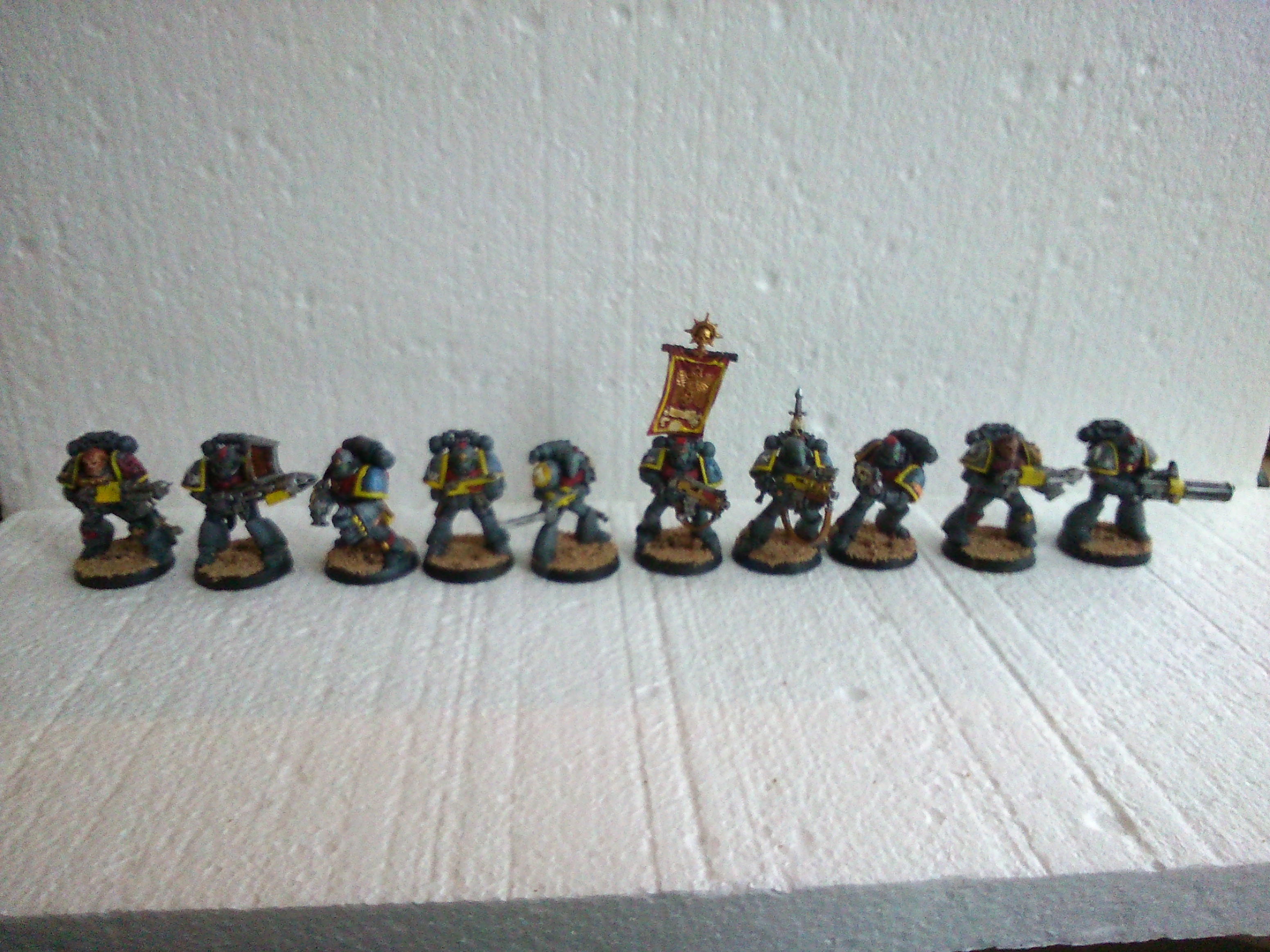 The rest of the squad. Note the two Space Hulk terminators hiding at the back here. Surprisingly tricky to paint, they were.
