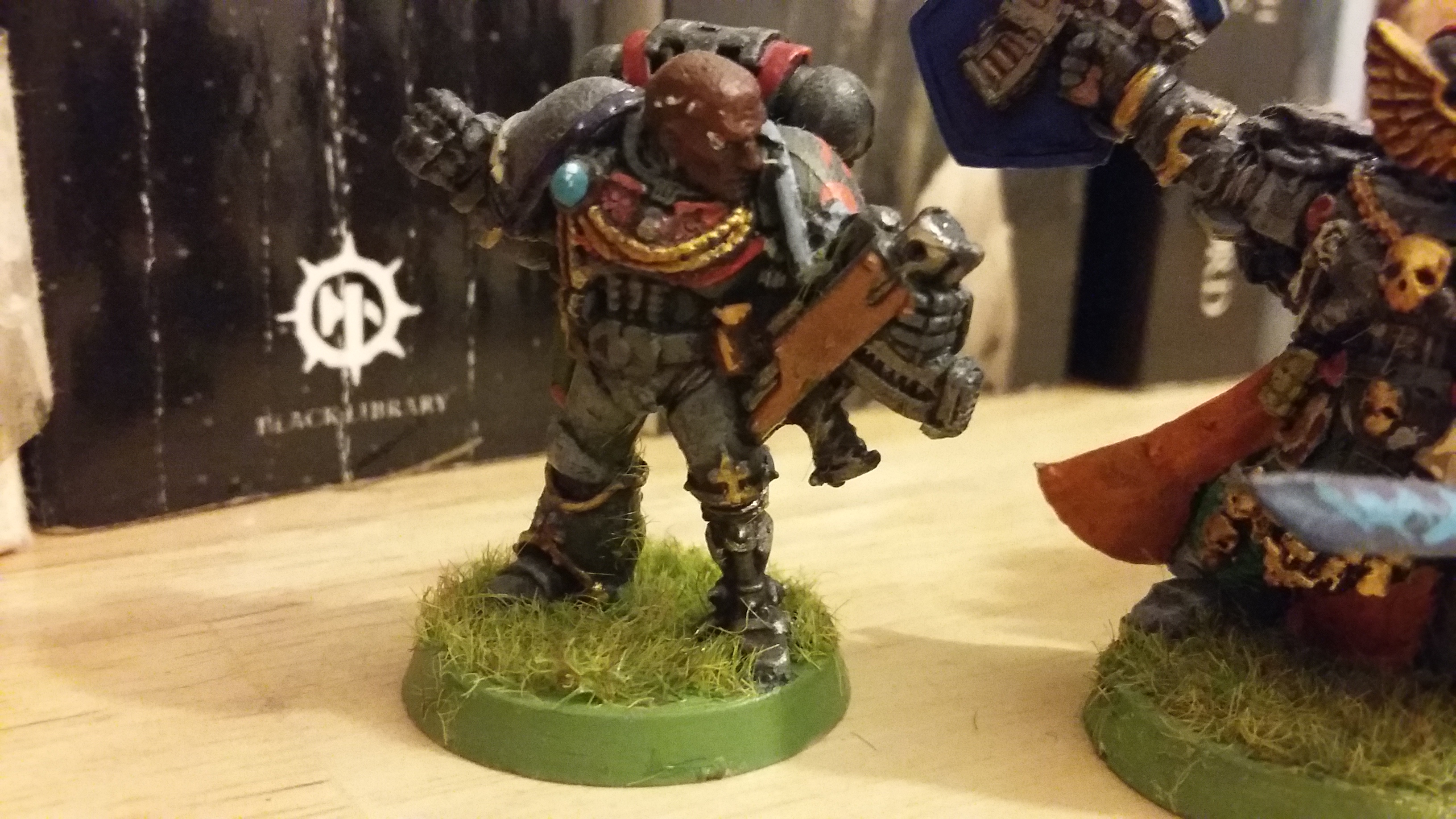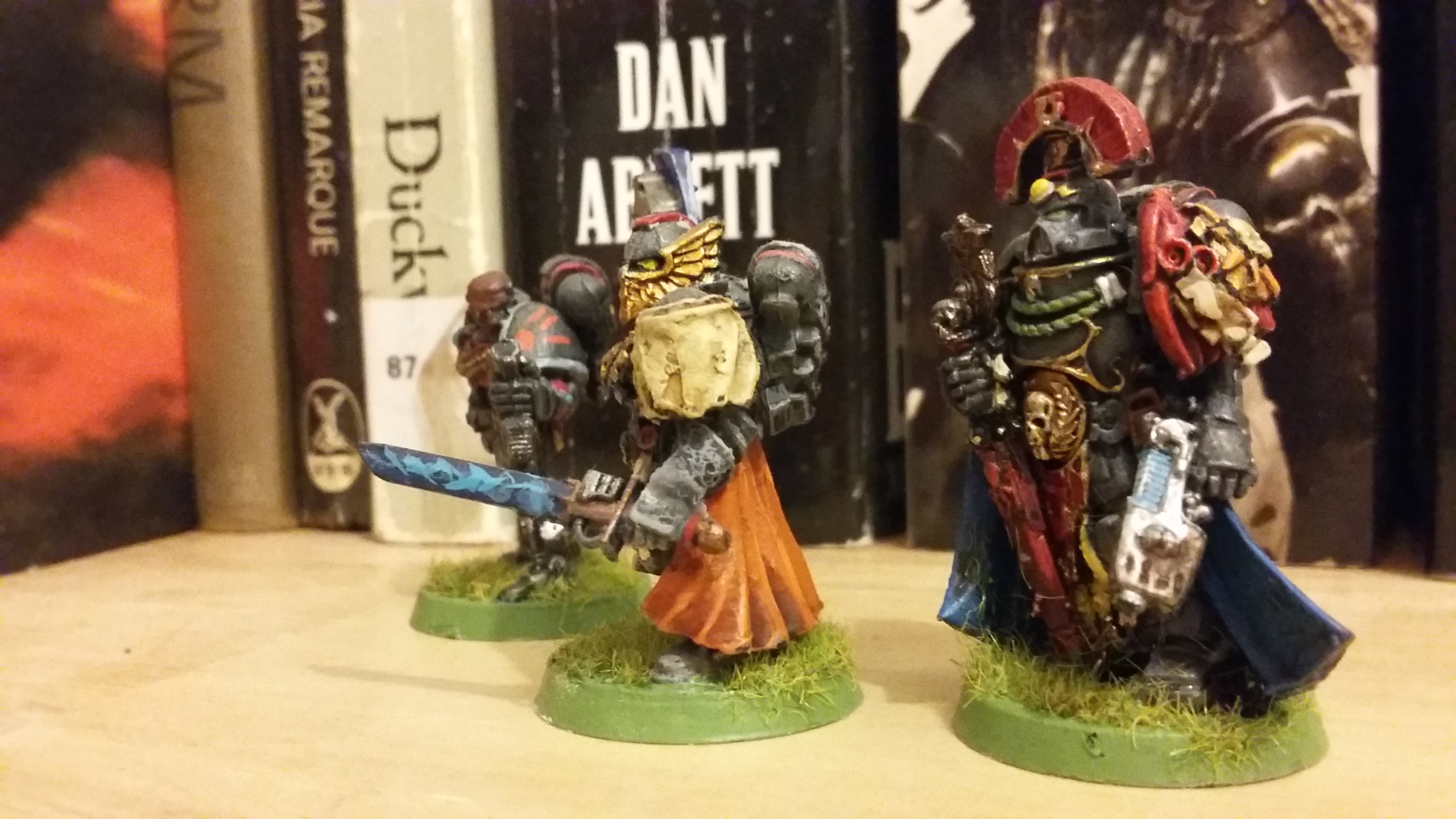 Good afternoon everyone, here’s a second set of Space Marine Honour Guard to follow the one I did a few months ago. It started as an excuse to renovate Honoured Brother Asmir, who I’ve posted before very early in this blog. Asmir got himself broken, so he needed a repair job, which I used as an excuse to put him on a base and slightly improve the paintjob. The other two are some of my favourite RT period Space Marines. The chap with the bionic bits is a a fantastic model, I’m counting that odd sword as a relic blade! The Ultramarines Captain is another great miniature, but it took so long to paint.
