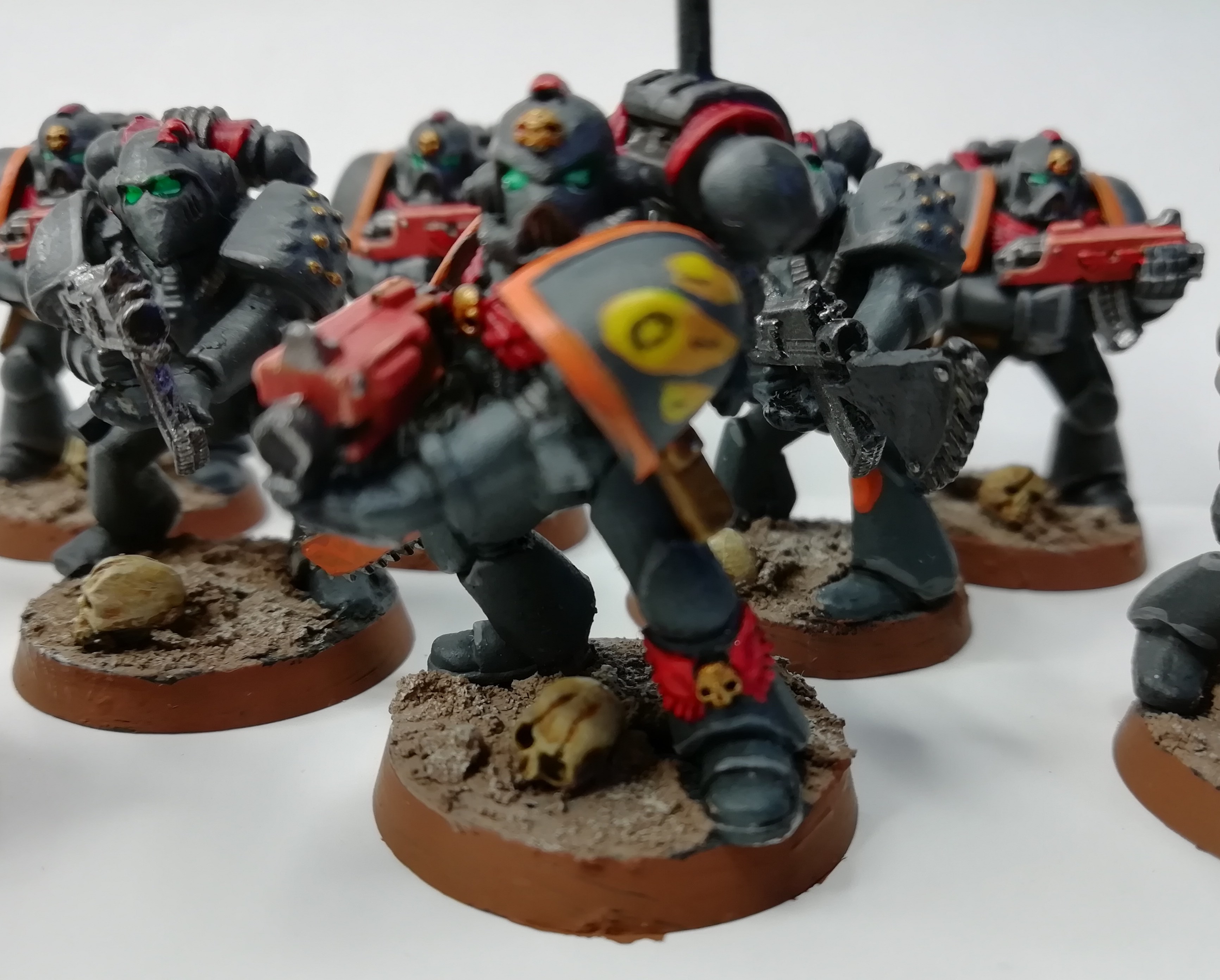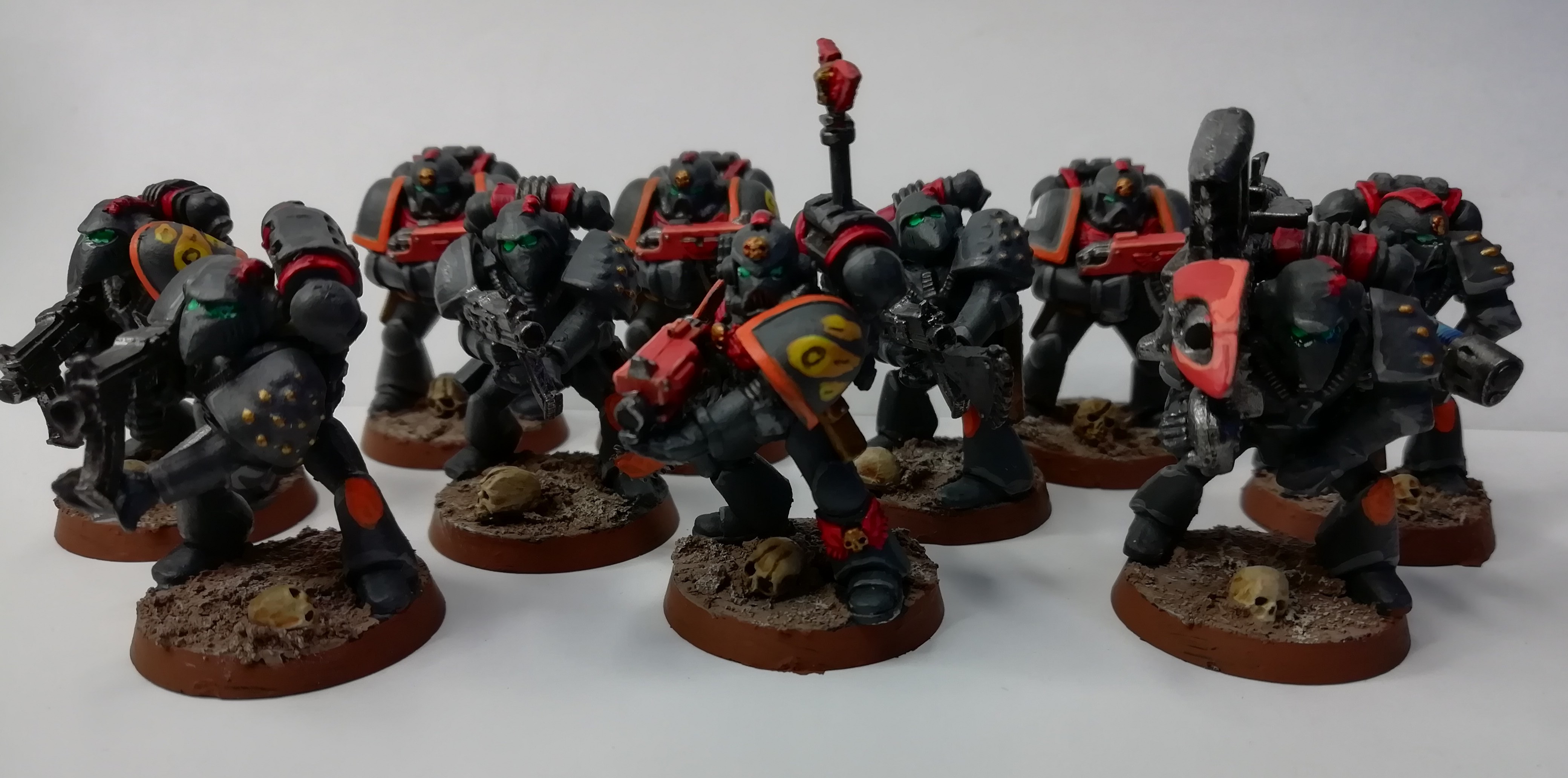 The rest of the squad.  Note the two Space Hulk terminators hiding at the back here.  Surprisingly tricky to paint, they were.